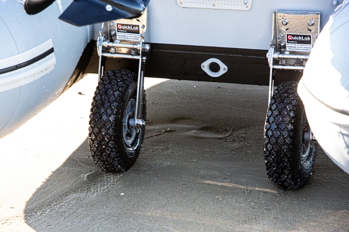 The large 10 inch diameter wheels will power over most terrain with ease. A simple self-locking mechanism keeps them in place whether they are in the up or the down position. In the unfortunate situation that your dinghy flips upside down with the wheels attached in the on water position, the auto-lock system will prevent them from detaching from the boat.